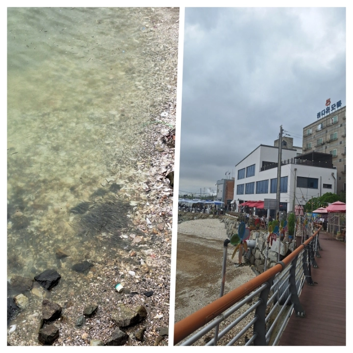 전망대 구경 후 되돌아가는 길에는 한진포구 맛집들이 눈에 띄었어요. 지금은 대하(새우) 철이라 대부분 소금구이나 해물칼국수 먹더라고요. 식당 바로 앞 바닷가에 유난히 작은 물고기 떼가 무리 지어 있어서 신기했어요.